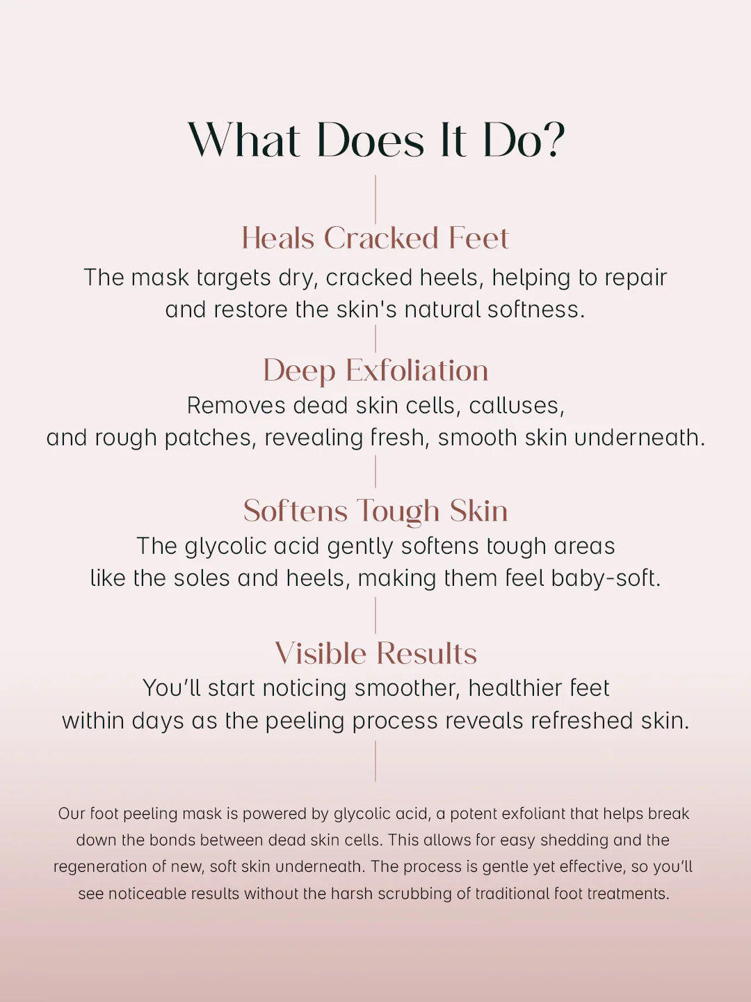 Slip into our easy-to-use foot mask socks for an indulgent pedicure experience. The overnight foot mask works while you relax, targeting calluses and rough spots with precision. In just a few days, you'll notice peeling that gradually removes the dead skin, leaving your feet baby-soft and refreshed. Safe for all skin types, this peeling & exfoliating foot mask is free from harsh chemicals, making it the perfect addition to your foot care routine. Say goodbye to dry heels and hello to smoother, healthier feet with our best-in-class foot peeling mask.